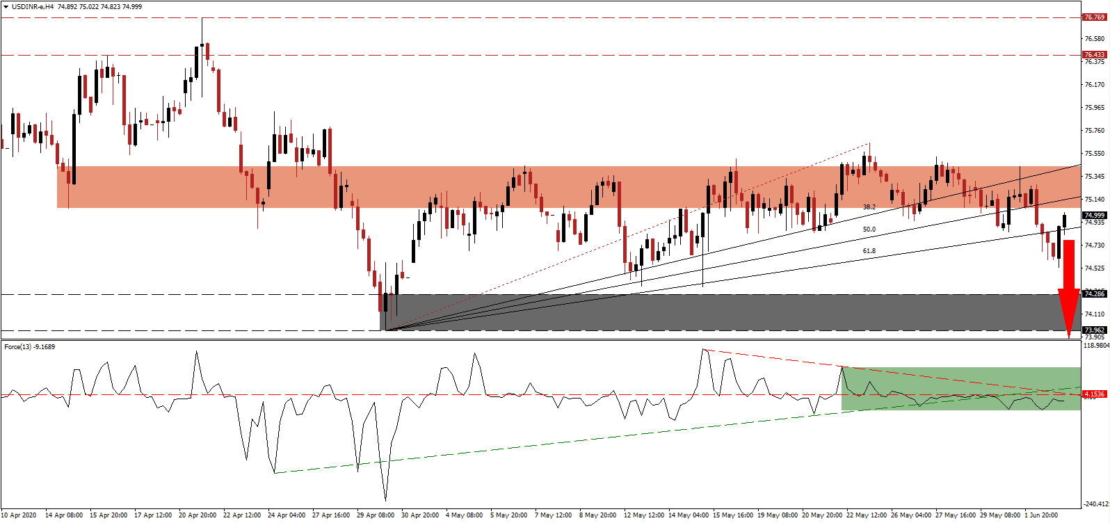 This morning’s Indian services PMI for May delivered a disappointing improvement from April’s all-time low. It confirms the economy has a long path to recovery, a fact evident across the global economy. Prime Minister Modi is under intensifying pressure to address an economic slowdown that started before the global Covid-19 pandemic forced nationwide lockdowns. Last week’s first-quarter GDP data showed an annualized expansion of 3.1%, the worst in eight years. The dismal recovery in the services sector mirrors last week’s manufacturing data. Despite disappointments, the USD/INR remains resilient on the back of more prominent concerns out of the US. The short-term resistance zone is favored to rekindle the dominant bearish chart pattern and inspire a breakdown.
