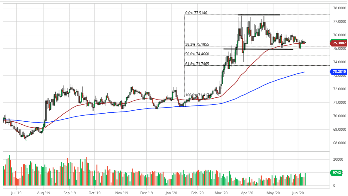 A lot of what will move this market is going to be risk appetite in general, as the Indian rupee is most certainly a prominent emerging market currency. There is a longer-term shortage of US dollars when it comes to debt in places like India, so I do think long term we will continue to see some type of strength. However, the intermediate-term set up suggests that if we break down below the ₹75 level, it is likely that we will be looking towards the ₹74 level underneath, which has been significant support and is backed up by the 61.8% Fibonacci retracement level.