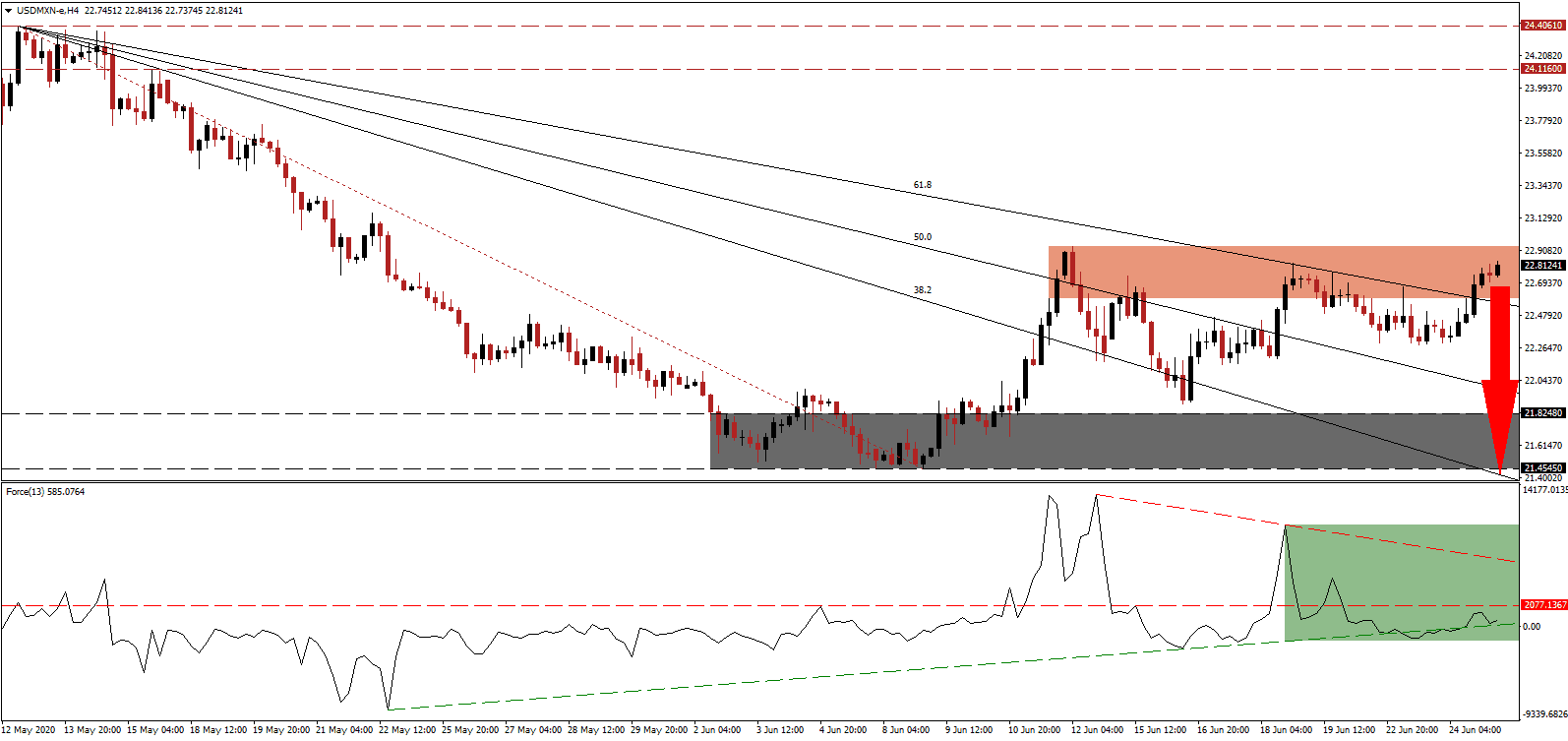 In the event the Force Index pushes through its descending resistance level, the USD/MXN may attempt a breakout. Given the negative progress out of the US, Forex traders are recommended to take advantage of any advance with new net short positions. The accelerated spread of the virus may force the reimplementation of quarantine measures across the US. Price action will face its next resistance zone between 24.1160 and 24.4061.