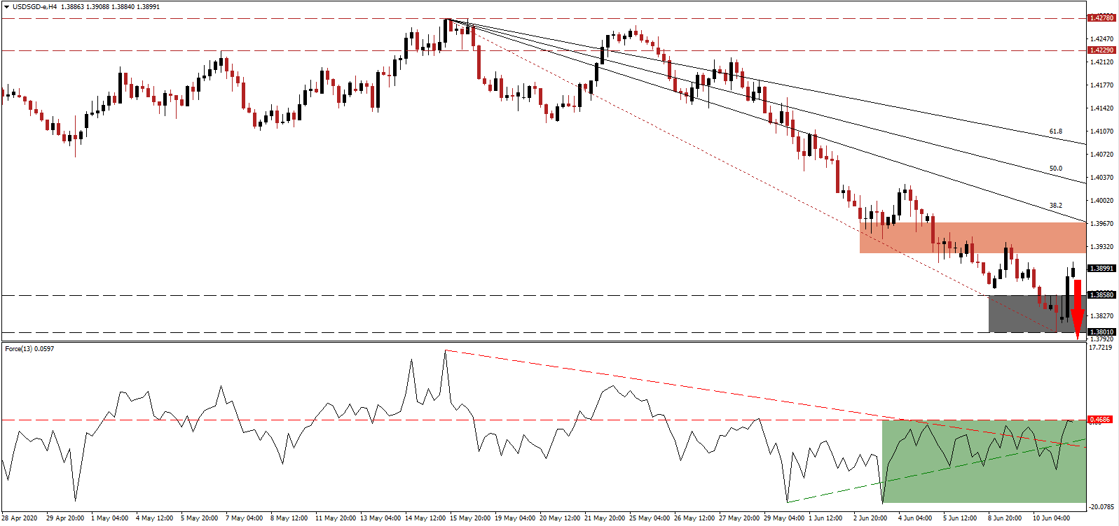 Should the ascending support level pressure the Fore Index farther to the upside, the USD/SGD is likely to attempt a breakout. The upside potential remains limited to its 61.8 Fibonacci Retracement Fan Resistance Level. Forex traders are advised to consider this an excellent secondary selling opportunity on the back of an increasingly bearish outlook for price action, enhanced by US Dollar weakness.