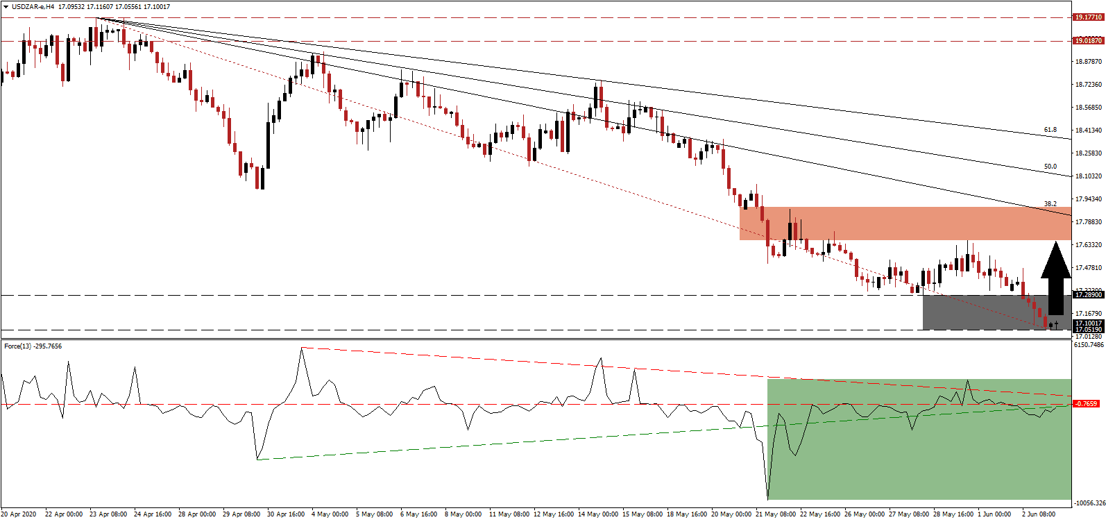 The Force Index, a next-generation technical indicator, resumes its drift higher following the recovery off of a new multi-month low. It is now challenging its ascending support level, serving as resistance, as marked by the green rectangle. The Force Index remains below its horizontal resistance level, and the descending resistance level is maintaining downside pressure. Bears are in control of the USD/ZAR with this technical indicator firmly below the 0 center-line.