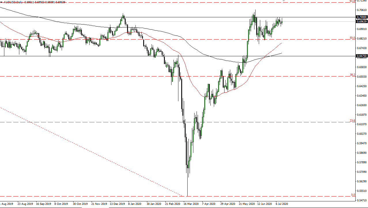 To the downside, I believe there is plenty of support near the 0.68 level, and furthermore the 50 day EMA coming into that level will confirm that from what I can see. This is a market that is very noisy in general but also has a lot of leverage to the Chinese situation and global growth in general. If both of those falter, that could be enough to send this pair much lower. I think given enough time we at the very least are probably going to consolidate in this area, so it is not a huge surprise to see this market pullback. Whether or not we can break down below the 0.68 level is a completely different question, but certainly, one that I think would resolve in quite a negative fashion if we do. In the sense, this is a market that is simply trying to figure out where it wants to go next, and we are killing time at what is an extraordinarily resistive area. On the one hand, you have a lot of fears about the global growth situation, which directly ties into the Australian economy. On the other hand, you have the Federal Reserve doing everything he can to bail everybody out, weakening the US dollar in the process. It is a bit of a “push-pull” still, but I think we should get some type of resolution rather soon. In the meantime, I think we bounce around in this 200 point range.