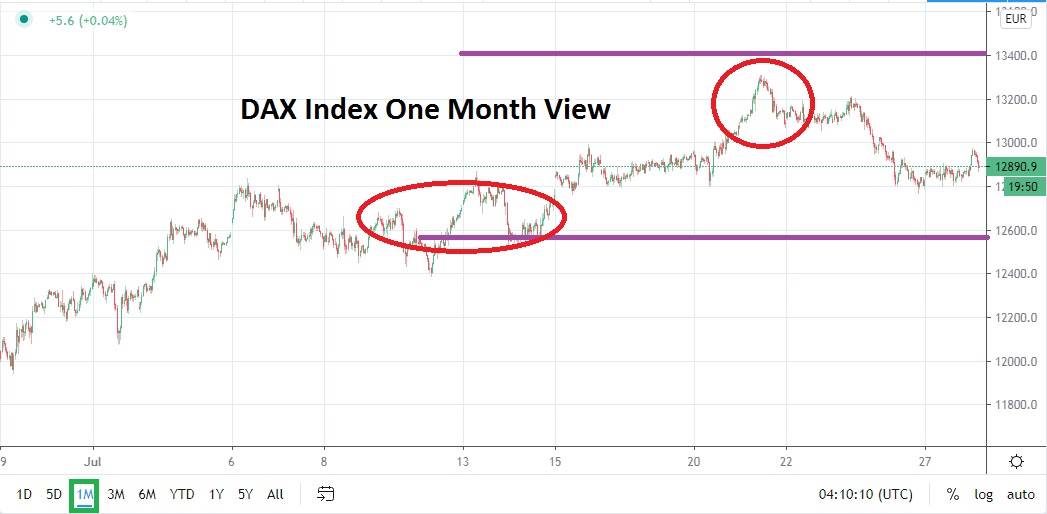 On the heels of a European Union announcement around the 20th of July that an economic package would be created to help EU nations battle the troubling economic prospects from the impact of coronavirus, the DAX Index soared to July highs. A level of approximately 13,300.00 was touched, but a quick selloff soon followed. Perhaps it was a case of too much too soon, or profit taking. However, the reversal downwards when looked at with mid-term charts still shows a strong bullish trend exists.