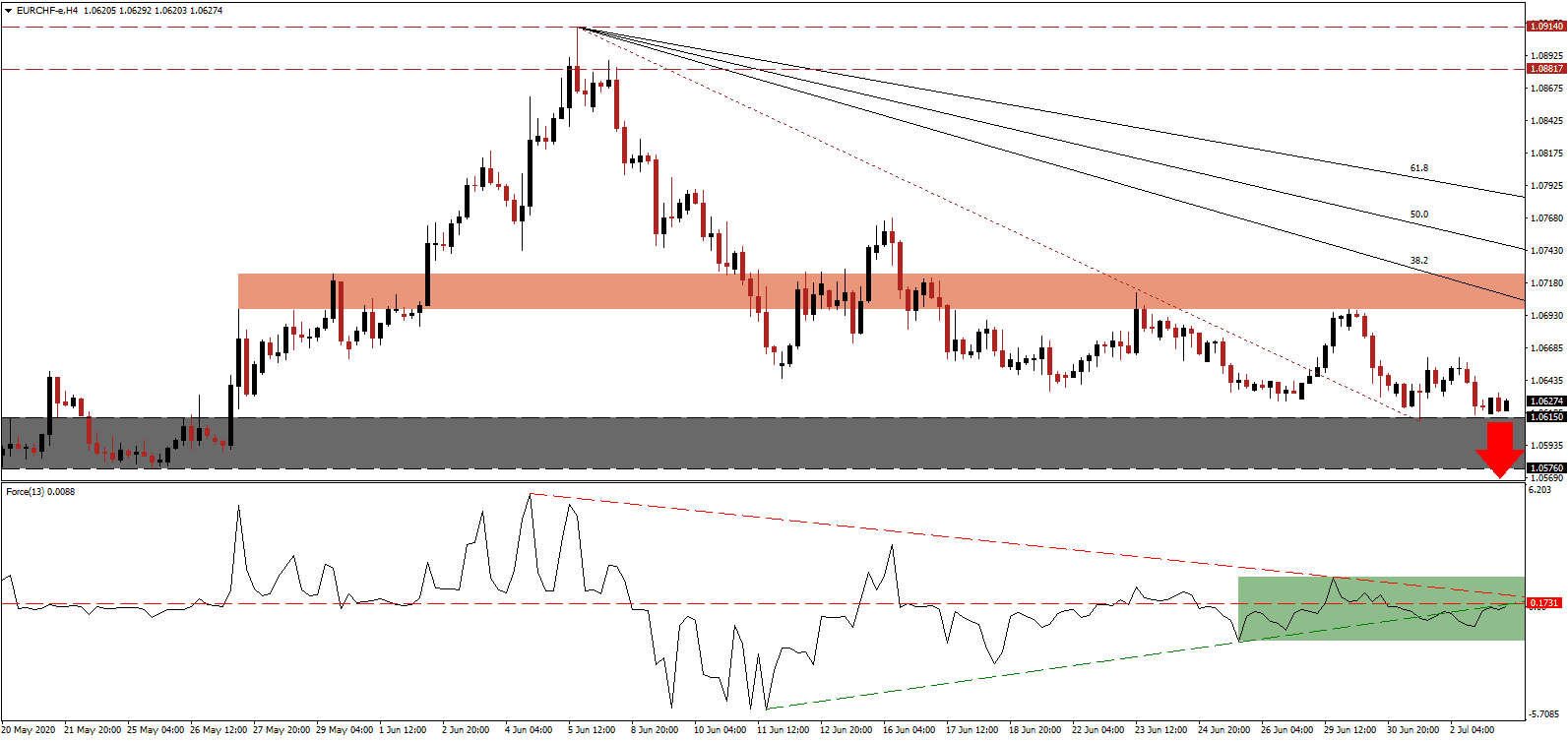 While the forward-looking KOF Economic Barometer increased by 9.8 points in June to 59.4, it remains well below its long-time average of 100. Any reading below 100 indicates the economy is underperforming. It also missed expectations for an increase to 77.0, while May was revised to 49.6 from 53.2. The manufacturing PMI disappointed, suggesting prolonged economic issues. The trend is mirrored across the global economy, while Covid-19 infections record new daily records. After the rejection in the EUR/CHF by its short-term resistance zone located between 1.0698 and 1.0725, as marked by the red rectangle, the dominant bearish chart pattern was confirmed.