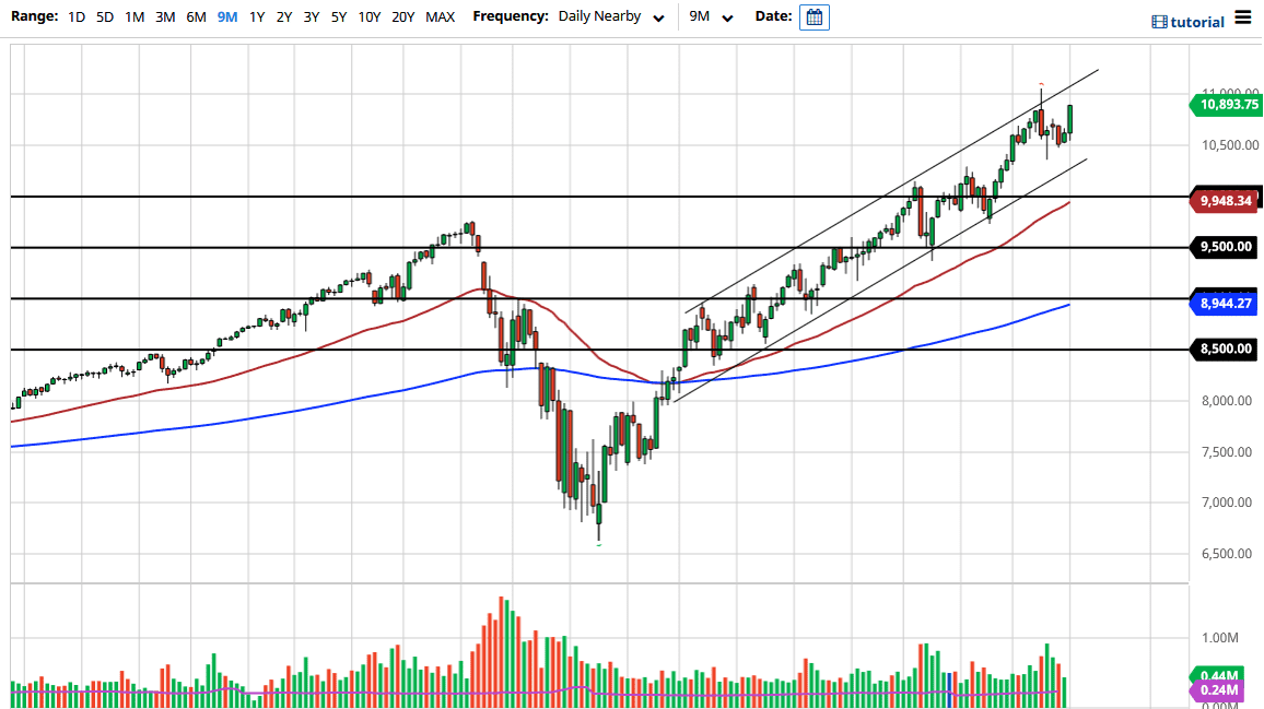 The NASDAQ 100 has rallied rather significantly during the trading session on Monday again, as Wall Street plows into just a handful of stocks as per usual. This is not a very healthy look at the market, but overall if you are trading the index it is what it is. We are reaching towards the 11,000 handle, an area that I thought could be rather crucial as it is not only a large, round, psychologically significant figure, but it is also the top of the channel. That continues to see a lot of attention, and I think that a pullback from that area would make quite a bit of sense.