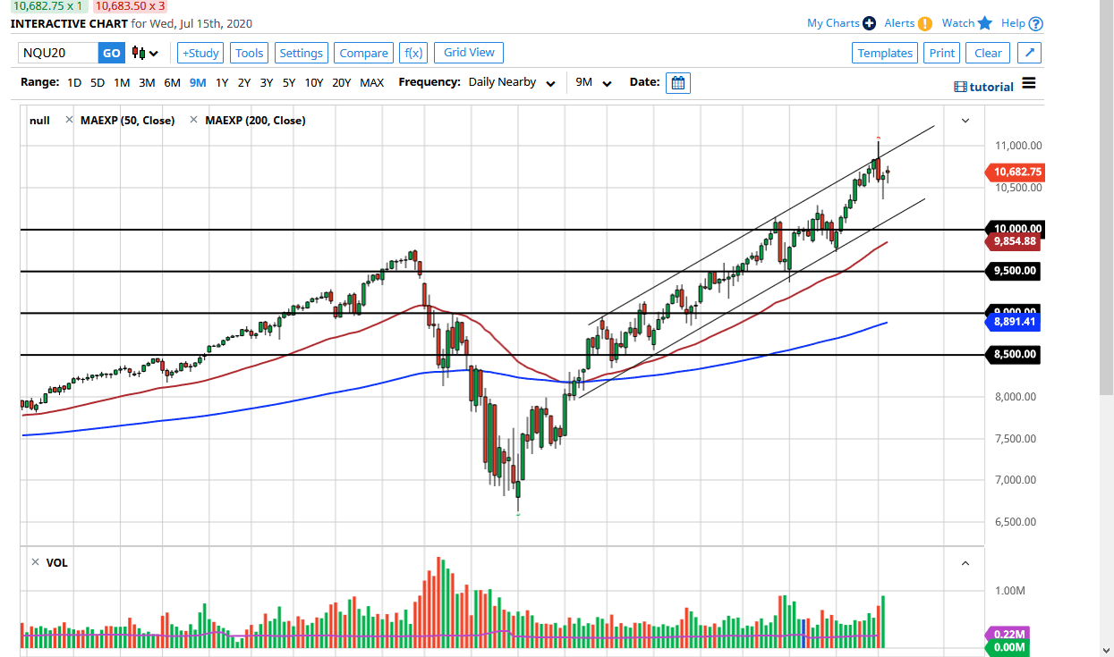 This is a simple matter of liquidity and the fact that money is being forced into the markets. If you are going to invest in companies right now, there is a really good chance that you will buy some type of passive investment strategy. There are literally hundreds of funds that feature stocks that make up a bulk of this index. Such as Netflix, Google, Facebook, Microsoft, and Amazon. In other words, this index has a really hard time breaking down unless the entire market is losing its mind. That does not mean it cannot, but it looks to me as if the 10,500 level has offered enough support to convince buyers to come back in.