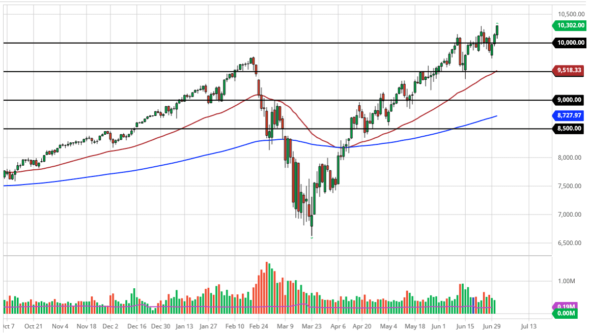 On the idea of a pullback towards the 10,000 level, I think there should be plenty of buyers, and therefore I think that we will see plenty of buyers paying attention to that large, round, psychologically significant figure and the previous buying pressure there. That would be a roughly 50% retrace of the most recent surge higher, so it all kind of lines up nicely. Even if it does not work out that way, I think there are plenty of buyers underneath willing to get involved. When you look at the chart, you can also see that the 50 day EMA underneath is crossing the 9500 level, which for me is the “floor” in the uptrend. After all, we have been forming a significant uptrend and channel for some time, and therefore it all lines up perfectly there. Short-term pullbacks I look at as buying opportunity and I have absolutely no interest in shorting the NASDAQ 100 unless something drastic happens. It would take a significant shift in attitude in order to make that happen, not something that I see in the short term, but we can always have some type of black swan event. In the meantime, as the index is comprised of the most popular stocks out there, it makes quite a bit of sense that we will continue to see the NASDAQ 100 rally in general. Unless you are willing to bet against Facebook, Microsoft, Amazon, and the like, you are going to struggle shorting this market.