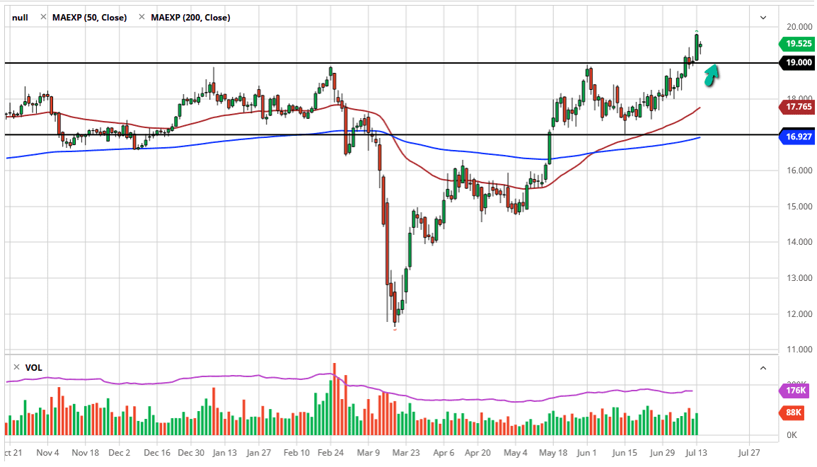 Looking at this chart, the $19 level underneath should be supported quite nicely, due to the fact that the area has significant resistance and there is a large, round, psychologically significant figure. Even if we break down below there, the 50 day EMA is starting to reach towards the $18 level, an area that had been important more than once. We are a bit of her stretched here though, so I think it is likely that we are going to see a certain amount of value hunting underneath. I like the idea of buying dips, especially if we can get like a $1.00 drop. If we were to somehow break above the $20 level, then the market is likely to continue running for a much longer amount of time, sending silver towards the $50 level eventually. Don’t get me wrong, I don’t think it happens overnight or anything, but it is most certainly an area that the market has tested the last couple of financial crises, so why would not it do it now?