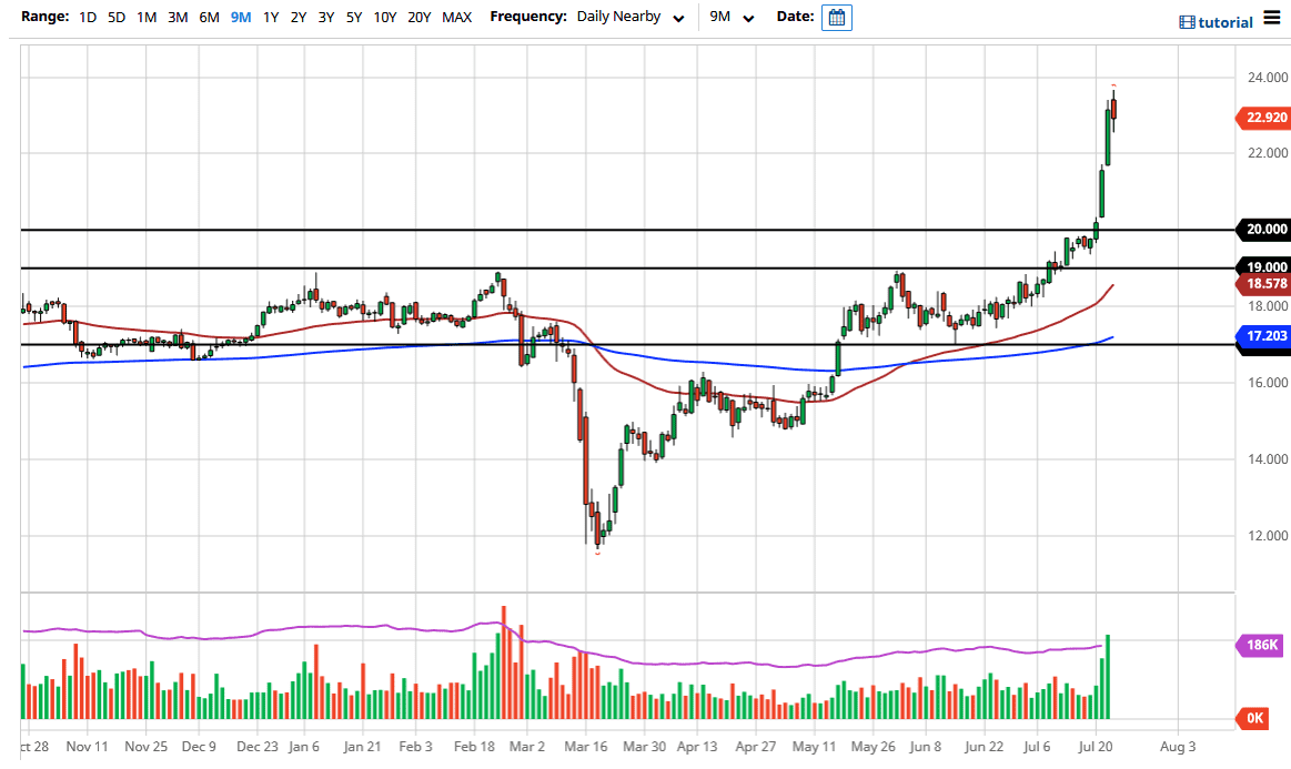 Silver markets have had an extraordinarily bullish view sessions, reaching towards the $23.50 level. Having said that, the market is likely to pull back because we have reached the stratosphere and are so far ahead of ourselves that the market desperately needs to see a bit of value enter the picture so people can get involved. After all if you are buying silver at this level you are looking to lose money. After all, all one has to do is think back to the Bitcoin market several years ago when it went straight up in the air and people lost an absolute fortune trying to buy Bitcoin close to the $19,000 level. That is essentially what silver is doing right now, although not quite so exaggerated.