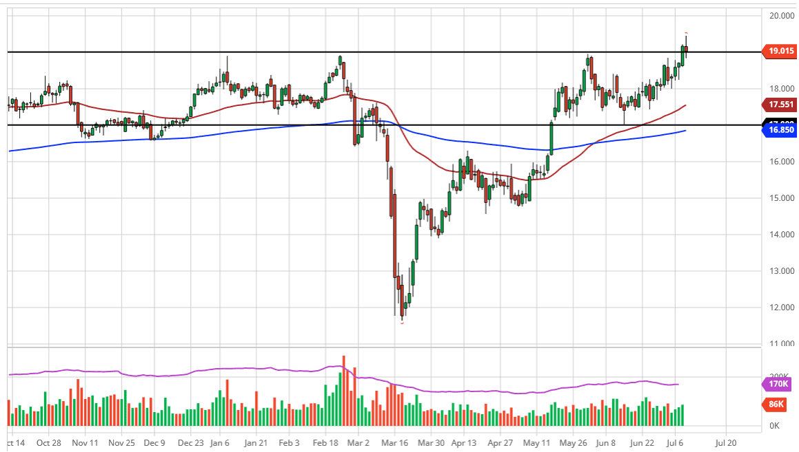 The silver markets have struggled a bit during the trading session on Thursday, initially shooting towards the $19.50 level before pulling back. We did end up forming a shooting star and that of course is a negative candlestick. However, I do not necessarily think that you can be a seller of the silver market, this just simply shows that breaking above the $19 level is going to take some momentum. After all, there is a lot of noise between $19 and $20, so I think it is only a matter of time before we see the market challenge that area again. Do not get me wrong, I think that there are still plenty of reasons to buy this market, but it is obvious that we are going to need several attempts I think to break out above the $20 handle. Once we do, that could send this market much higher as it would open the door for another move like we had seen during the Great Financial Crisis.