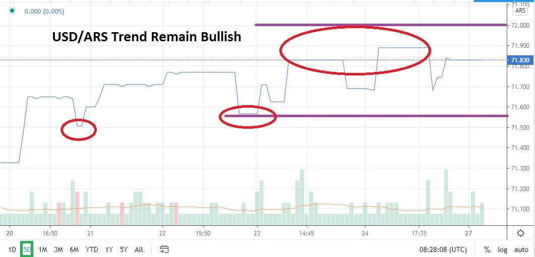 A five-day chart for speculators looking at pure technical charts shows the ability of the Argentina Peso to sometimes test support below after it has broken higher to new resistance levels. However, traders must keep in mind if they are speculating on the value of the USD/ARS that they are undertaking a completely virtual trade.