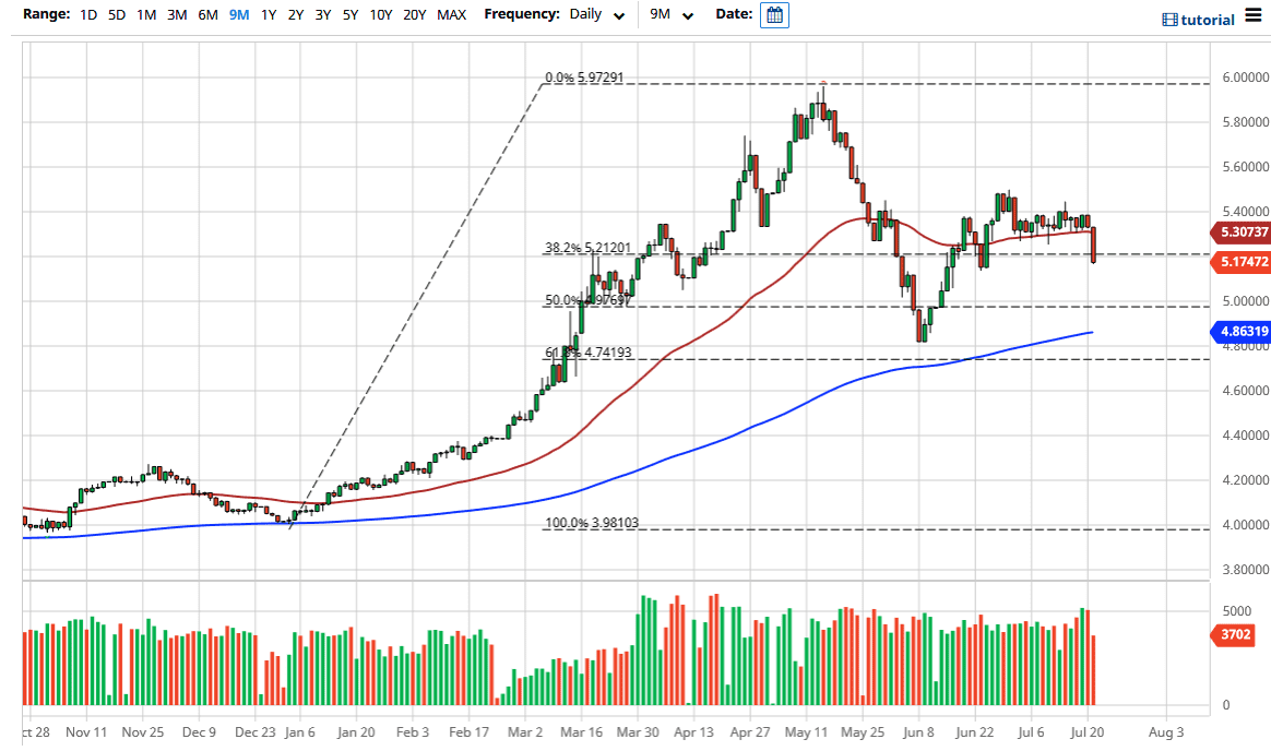 During the trading session on Wednesday, the market broke down below the 5.20 Real level, and even the 50 day EMA. I think this is a market that will continue to sell off and therefore I like the idea of fading short-term rallies that show signs of exhaustion. At this point, it looks like the market is probably going to go looking towards the 200 day EMA underneath, which is just below the 5 Real level. After all, the US dollar continues to be looked at upon with suspicion as the Federal Reserve simply buys everything you can, and it would not be a huge surprise to see the Federal Reserve step in and start buying stocks next. With the Federal Reserve out of control, the US dollar will be punished, and the most telling picture of this is not necessarily this pair, but the fact that the Euro broke above the 1.15 level finally. Remember, the Euro is the “anti-dollar”, and therefore it is bought if the US dollar is sold off. Ultimately, I think this is a market that continues to see a lot of volatility, but I do believe that the 200 day EMA will be tested given enough time.