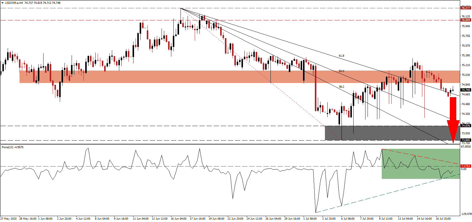 In case the Force Index pushed above its descending resistance level, the USD/INR is likely to follow suit. With the US under intensifying economic pressures and a growing healthcare crisis, Forex traders should consider any advance as a selling opportunity. Localized shutdowns are favored to expand as hospitalization surge across the country. The upside potential remains reduced to its resistance zone located between 76.049 and 76.277.