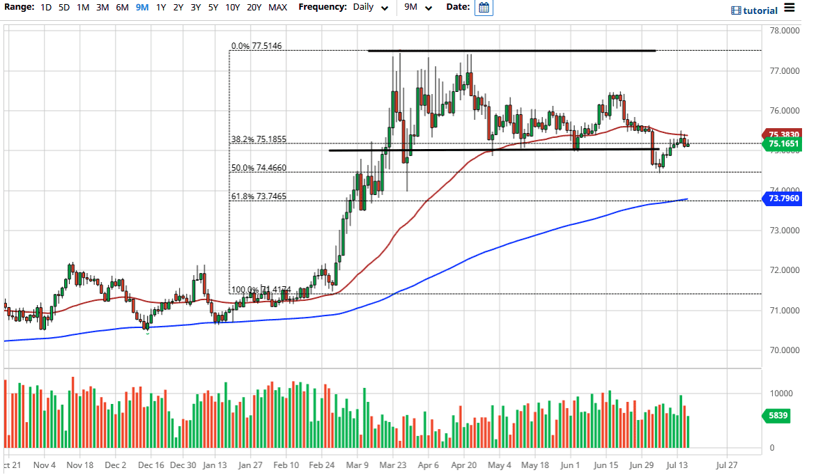 The Indian rupee initially lost a bit of ground against the US dollar during the trading session on Thursday, but continues to find a little bit of strength, or perhaps the better way to look at this pair is that we continue to see US dollar weakness. Because of this I believe that this market may continue to drift a bit lower, because we did break down below the ₹75 level, an area that I had talked about previously as being potentially important. As you can see, the market has since revisited that area and now we are starting to drift a little lower.
