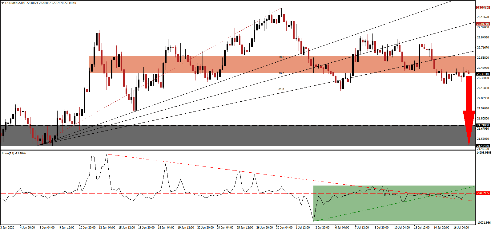 Mexican pension funds witnessed record withdrawals in June of Mex$1.86 billion, lifting the total first-half number to Mex$8.57 billion, amid soaring unemployment. Formal June job losses clocked in at 83,000, down from May’s 345,000. Mexican President López Obrador assured his country that job losses would end in July. The USD/MXN maintains its bearish chart pattern following the breakdown below its ascending 61.8 Fibonacci Retracement Fan Support Level, converting it into resistance. It is magnified by the move below its short-term resistance zone located between 22.3891 and 22.6044, as identified by the red rectangle.