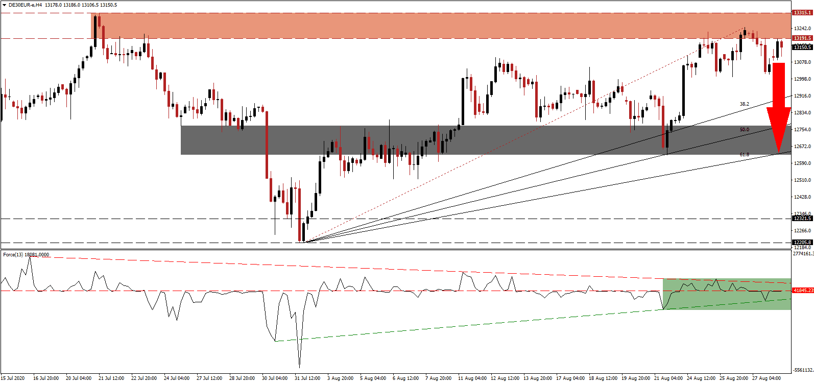 Per data from the German Federal Statistical Office (Destatis), second-quarter GDP plunged by 9.7%, representing a record since data monitoring commenced in 1970. It marks a small upward revision from the initially reported 10.1% drop, and German business confidence improved in August, according to data by the Munich-based Ifo Institute for Economic Research. Bearish pressures remain dominant in the DAX 30 following the breakdown below its resistance zone located between 13,191.5 and 13,315.1, as marked by the red rectangle.