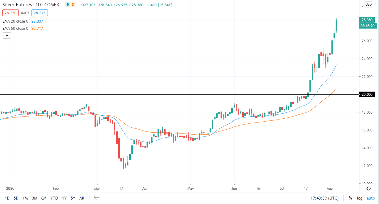 Underneath, I see the $26 level as massive support, as it was previous resistance. Underneath there, the $24 level will offer plenty of support, just as the 20 day EMA which is just below there well. In other words, if we break down, and I am not going to lie here - I hope it does, I am more than willing to buy silver “on the cheap.” That is the only play you have because the more parabolic this market goes, the less stable it will be by the time it is all said and done. If that is going to be the case, you can probably expect some type of massive and sharp pullback. That massive and sharp pullback will shake out a lot of the “weak hands”, which should give you an opportunity to make some money as value comes back into the markets. I have no interest in shorting, and I think that given enough time we will find plenty of value hunters out there to drive this higher.