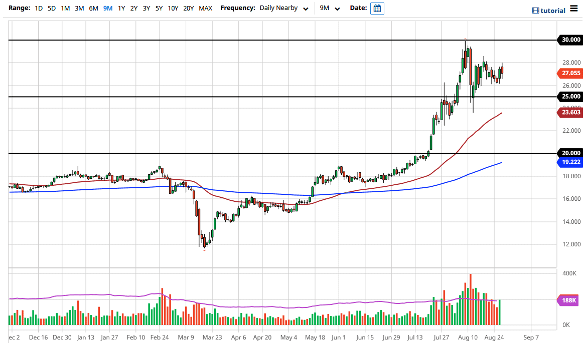 Looking at the candlestick, it shows that we do have a certain amount of support underneath, especially near the $26.50 level. The $28 level of course has offered resistance again, which was the previous level of resistance. We have bounced a bit off of the bottom, so that is somewhat positive, but I do not anticipate that this market is going to simply take off. I think that buying on the dips continues to be the best way to go going forward, as we clearly have a lot of interest underneath. After all, the US dollar is going to continue to be beaten on a bit, and I think that will continue to drive precious metals in both directions, as they tend to move in the opposite direction of the greenback.