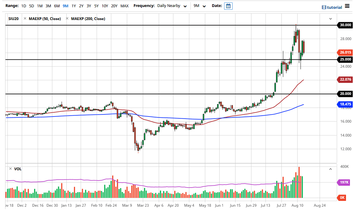 Silver markets have fallen a bit during the trading session on Friday, as we have seen a bit of profit-taking, or perhaps just simple consolidation. After all, the market has been very volatile during the week so it should not be overly surprising that we continue to see selling spats as well. We have dropped towards the $26 level before bouncing a bit towards the end of the day but what I am looking at is the overall trend.