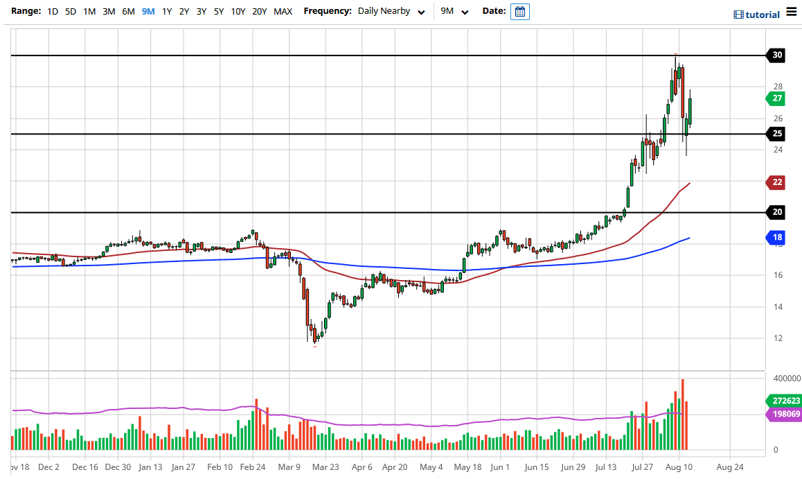 The $25 level is an obvious support level that is going to continue to be paid attention to, so keep your eyes open for any type of buying opportunity down in that general vicinity. However, I do not know that we get all the way down there anytime soon. Short-term pullbacks will more than likely be bought as the trend is decidedly bullish. Furthermore, the Federal Reserve will continue to loosen monetary policy and flood the market with greenbacks, so therefore it is going to take more of those greenbacks to buy an ounce of silver. This is simple math, which continues to be one of the easiest ways to trade a market. Having said that, that does not mean that you simply buy with both hands, rather you look for value.