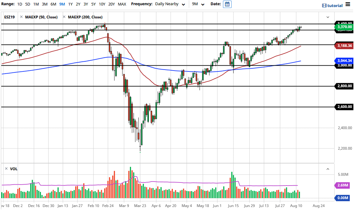 The S&P 500 and a quiet session on Thursday, as we are starting to see a lot of issues with trader interests. After all, most of whom are focusing on holidays right now, as this is typically the vacation season. This being the case, we may struggle a bit to continue moving to the upside, however some traders will look at any pullback as a potential buying opportunity. For myself, I do believe that pullbacks are buying opportunities as the all-time high just above makes a juicy target for a lot of traders to go reaching towards. This of course is the 3400 level, and the NASDAQ has already broken the highest several times, so the S&P 500 should more than likely follow given enough time.