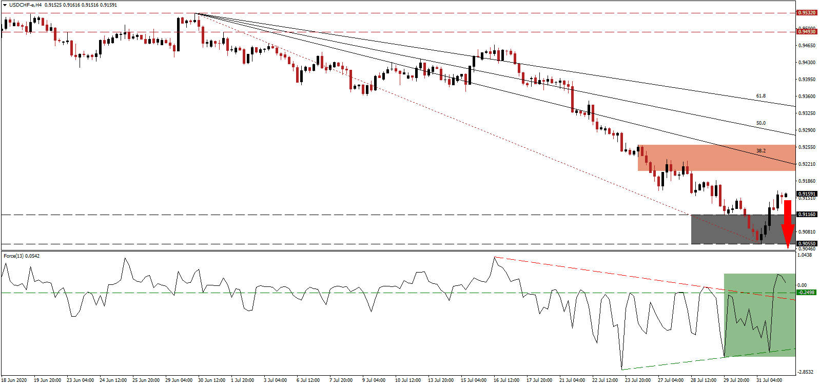 Due to the restrictions imposed to slow the spread of the Covid-19 pandemic, hours worked by over 360,000 temporary workers fell by 23% in the second quarter, highlighting ongoing economic pain. The Federation of Staffing Companies remains concerned over the prospects in the second half of 2020. Over 20,000 unemployed receive additional assistance by the government, set to expire at the end of August. The USD/CHF is under intensifying breakdown pressures from its descending 38.2 Fibonacci Retracement Fan Resistance Level. It presently passes through its downward revised short-term resistance level located between 0.9206 and 0.9260, as identified by the red rectangle.