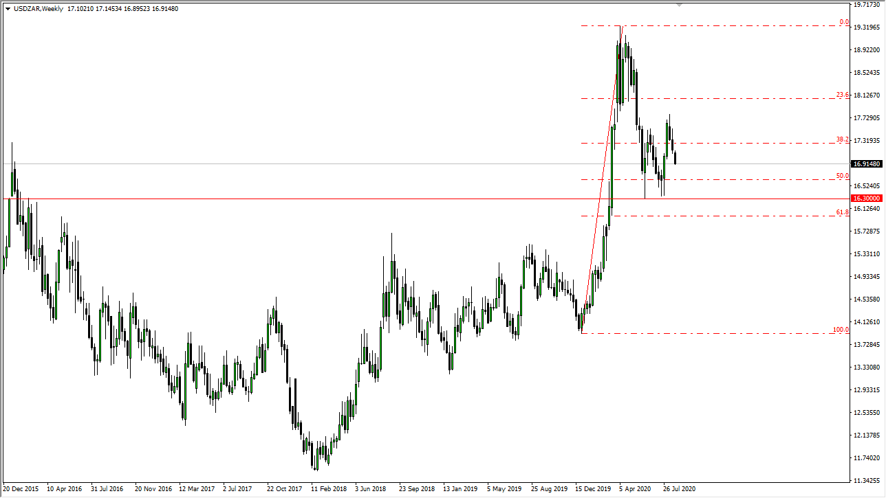 The South African Rand will more than likely move along with other emerging market currencies such as the Brazilian real, Indian rupee, and Pakistani rupee. It is only a matter of time before we see some type of bigger move, but right now I would not be surprised at all to see this market go back and forth between these two major levels, due to the fact that there are a lot of moving pieces. It is obvious that the 16.30 Rand level is an area of major support, so if it gets broken, that means that something good has happened.