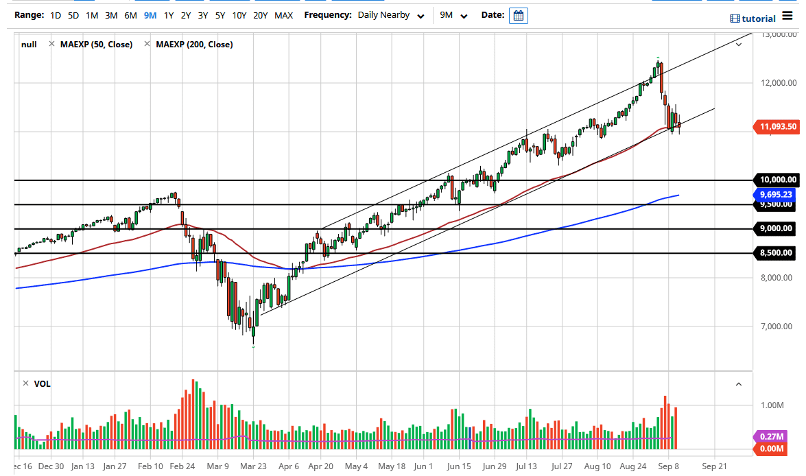 While the chart does not necessarily look good at the moment, the one positive thing that I do take away from it is that we did not completely lose it during the trading session on Friday as we could have. Because of this, I think there is at least a small victory that you can take away from the price action on Friday as we did bounce rather significantly from the 11,000 handle. The question now is whether or not traders will come back in a good mood on Monday or not.
