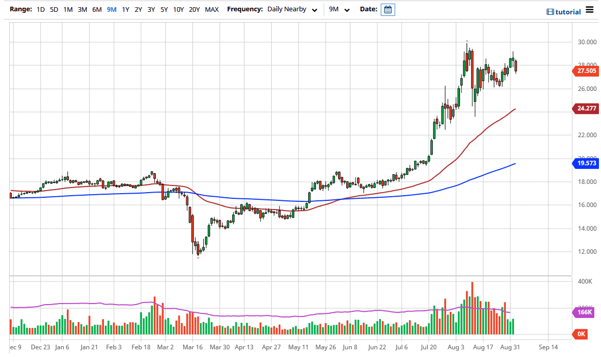 To the upside, the $29 level begins significant resistance that extends all the way to the $30 level. If we were to be able to break above the $30 level it is likely that it would lead to a bigger move much higher. A breakout above that level could send this market much higher, perhaps even as high as the $50 range as we have seen multiple times in the past. Having said that, we have been very bullish for some time, so it may take a bit of digesting to continue the uptrend. After all, when you look at this chart you can see that we shot straight up in the air, and now we are simply just grinding back and forth. I like the idea of buying dips and taking advantage of value when it occurs, but I think you also should be very cautious and realize that the volatility is likely to be very strong, and the choppiness will be a major issue going forward. Keep your position size relatively small to protect your account.