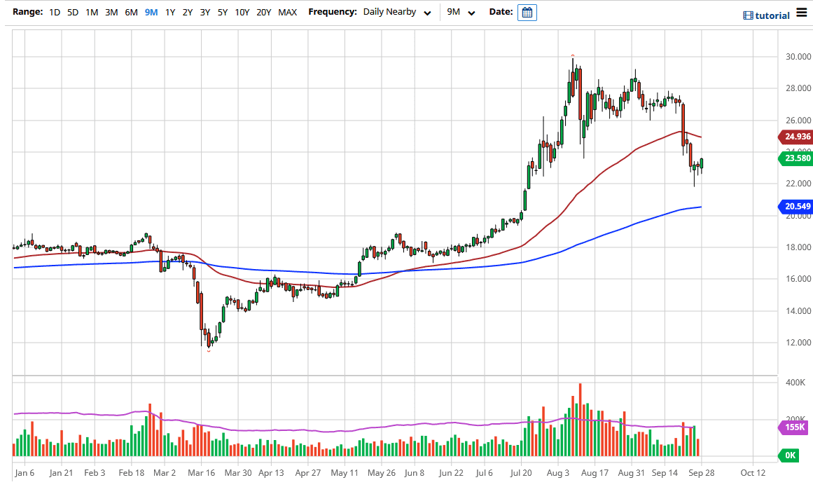 If you are looking for the safety trade, silver will not be where you need to go. If you are looking for a way to sell the US dollar, silver can serve that function quite well, but the reality is that silver is also extraordinarily volatile and then when it comes to the futures market. Silver contracts have nowhere near the volume of gold, and that is why you see massive moves. Furthermore, the contracts are much bigger, so it takes a lot less to wreck your account if you are not very careful. With that in mind, I am bullish silver, but I also think that you need to “leg into it very carefully”, and perhaps buy dips along the way. I am much more bullish when it comes to silver closer to the $20 level that I right now, because quite frankly we have not found a major support level quite yet. This looks like it could be a simple bounce that reaches towards the $25 level. I am not saying we cannot turn around here, just that it is not necessarily the optimal entry.