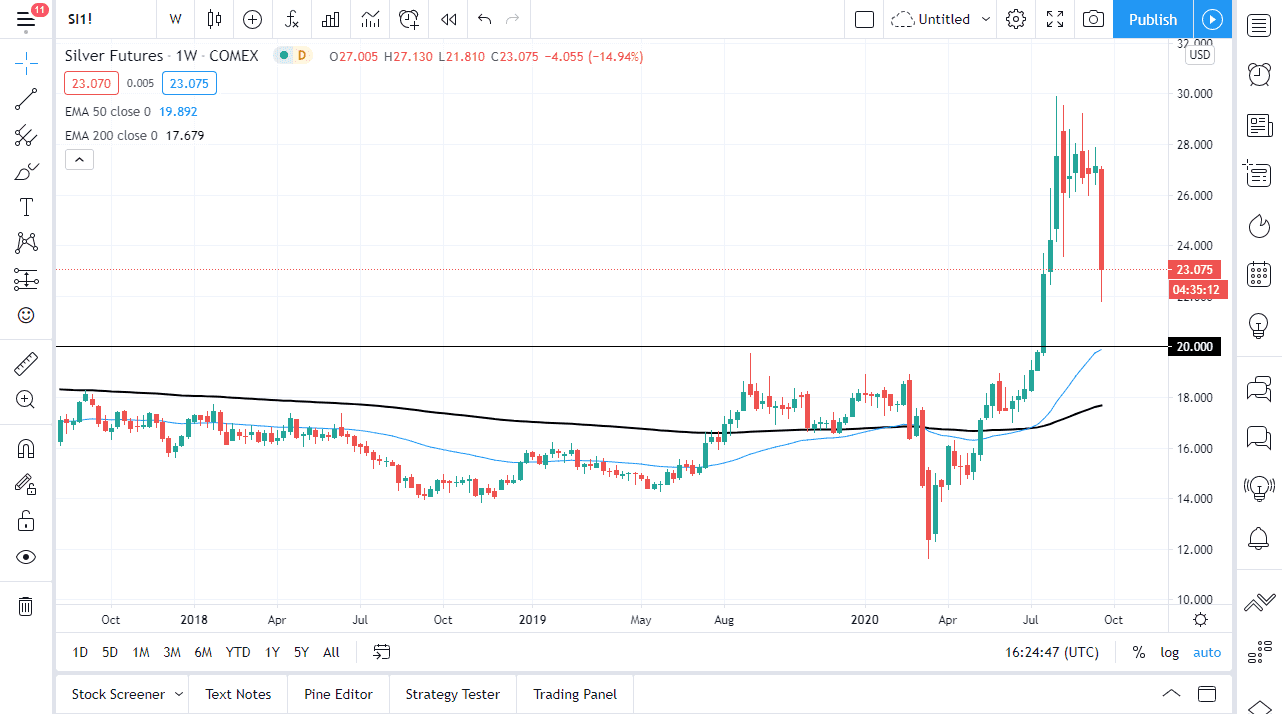 All that being said, I believe that the $20 level underneath would be an excellent price to get involved, and I think it is very possible you may get that opportunity. That does not mean that we will rally between now and then, but I do recognize that after the nasty candlestick that we have had during this past week, there is normally some follow-through even if you do get a bit of a bounce. With that in mind, I believe that the beginning of months will probably be relatively soft for silver, but by the time we get towards the end of October I anticipate that the Federal Reserve or somebody out there will do something to pick up risk assets again, thereby sending silver higher. I also recognize that the $30 level above is the “ceiling” at this moment without some type of major catalyst. Historically speaking, if you can get above the $30 level, you are going to go looking towards the $50 level. If we break down below the $20 handle, I think at that point we need to start reevaluating the entire situation.
