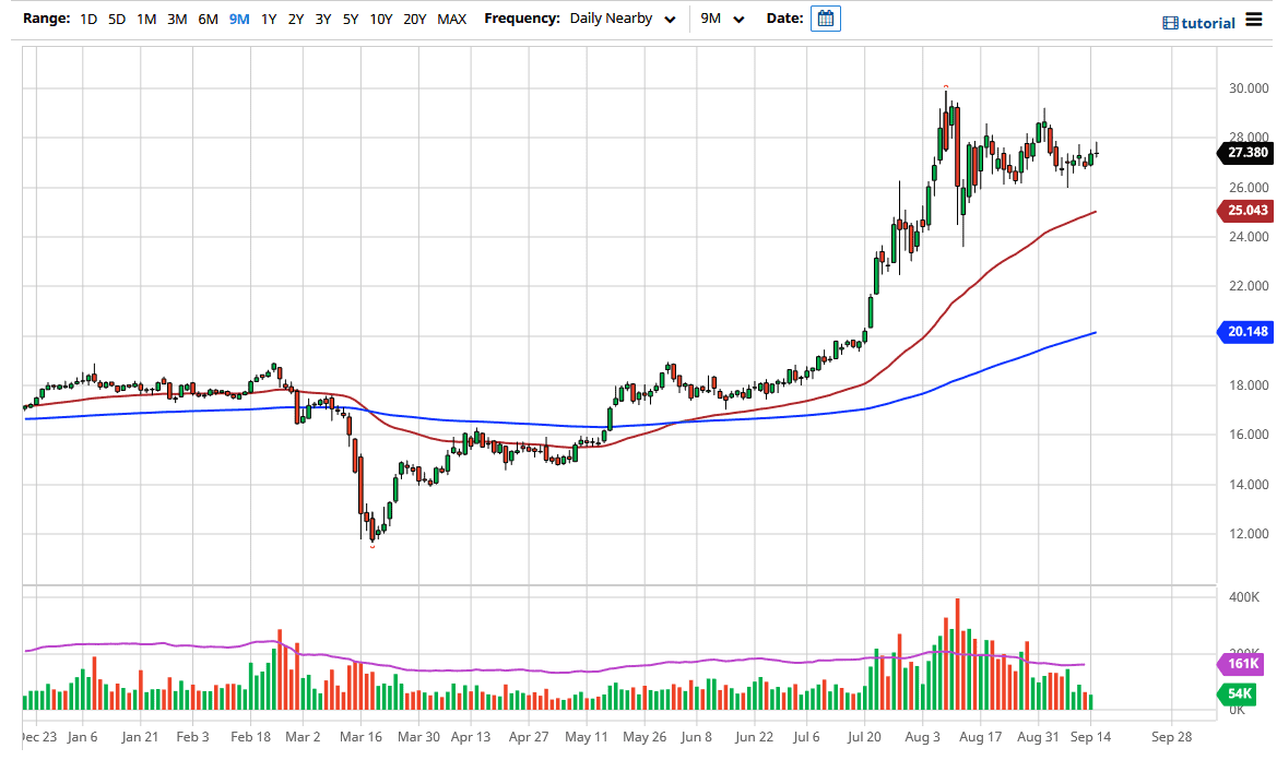 Silver markets rallied after gapping slightly higher at the open on Tuesday again. However, we continue to see a lot of resistance above near the $28 level. Because of this, the market rolled over and started to sell off again. The $28 level continues to be a sticking point for the market, so I think it is difficult to get above there. If we were to break above the $20 level, it is likely that the market could go looking towards the $29 level. Above there, the market then goes looking towards the $30 level.
