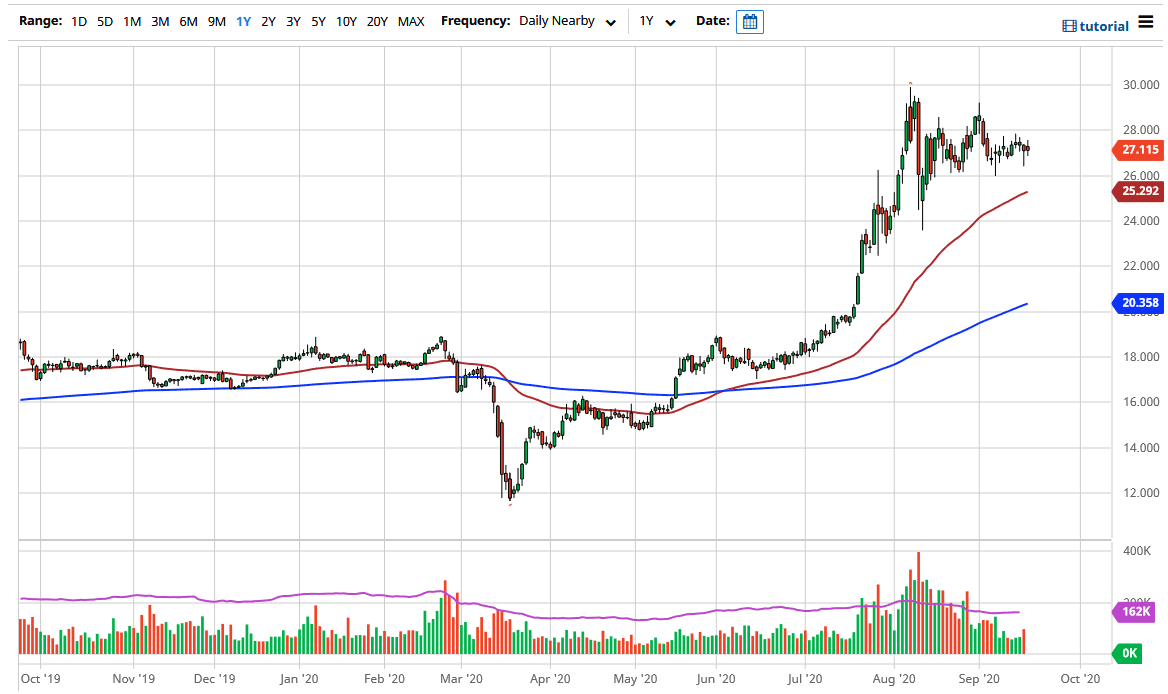 As long as that is the case, I think that this is a market that will be short-term range-bound trading only. I think that short-term traders will continue to flock towards this market, as it is offering a nice range that is clearly defined. However, if we break down below the $26 level then I think the 50 day EMA comes into play as well as the $25 level which is a psychologically significant figure. Even if we break down below there, I think that it is only a matter of time before the silver markets picked back up again as central banks around the world continue to throw tons of liquidity into the marketplace which typically has people looking for hard assets.