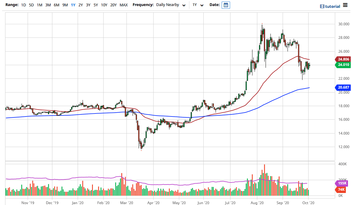At this point in time, it is likely that the $20 level will determine whether or not we are still in an uptrend. We could have a pullback all the way to that level and still be very strong over the long term because we had gotten far ahead of ourselves. The biggest problem with silver is that it is not as much of a safety trade as gold is, because silver has that major industrial component that core would suffer in the current environment. With that being the case, I think that it is only a matter of time before we see some type of bigger move, and I recognize that if we were to close above the 50 day EMA on the daily chart then it is likely that we could go looking towards the $27 level. I do not expect that to happen, but I have to keep my mind open to both potential moves, but at this point, the thing that I would stress is that I am not looking to short the market. Instead, I am looking to find value at lower levels because I believe in the long-term efficacy of an uptrend when it comes to precious metals in general.