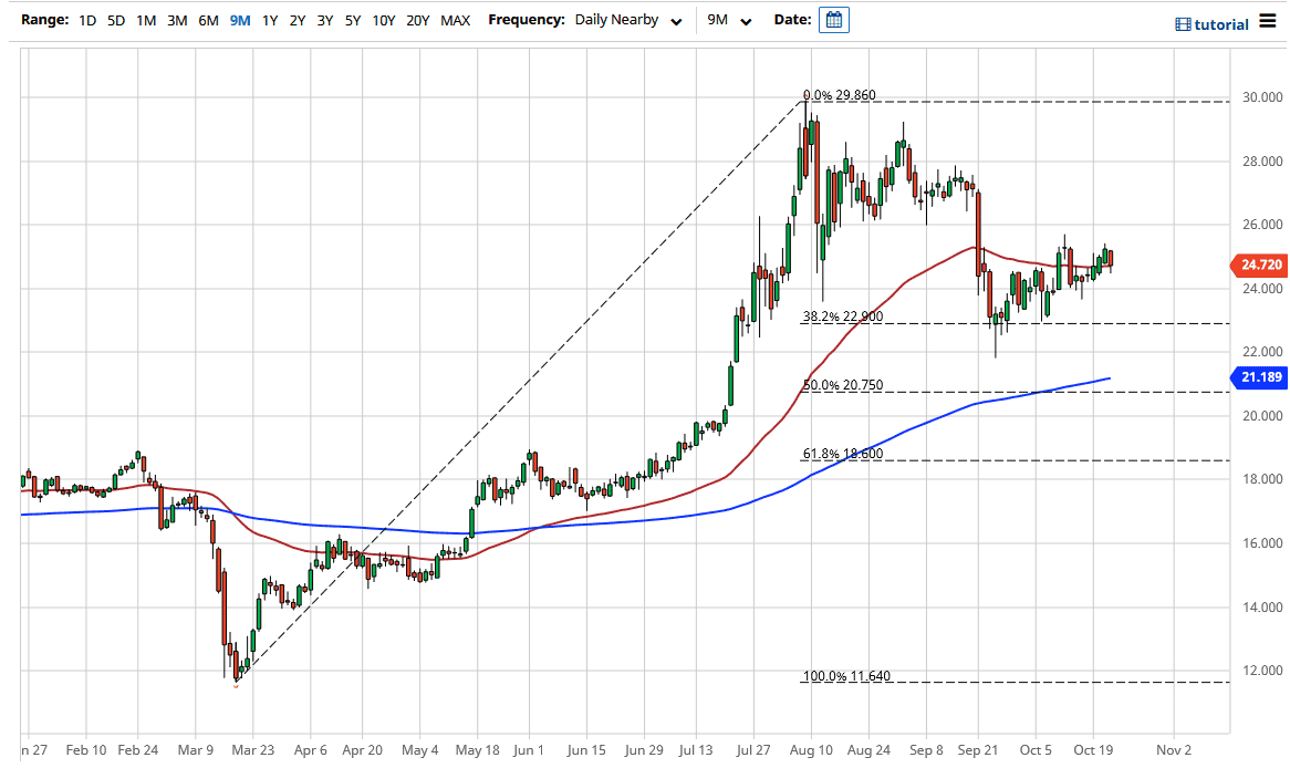 Looking at this chart, the 50 day EMA of course has offered some attention and support, but ultimately it is likely that we could break down below there and go looking towards the $24 level, possibly near the $22 level after that. Underneath that, the 200 day EMA offers support and I think that longer-term trade will favor the upside in general, as the US dollar will probably struggle due to massive stimulus. Furthermore, silver also gets a boost due to other central banks around the world doing everything they can to flood the markets with liquidity.