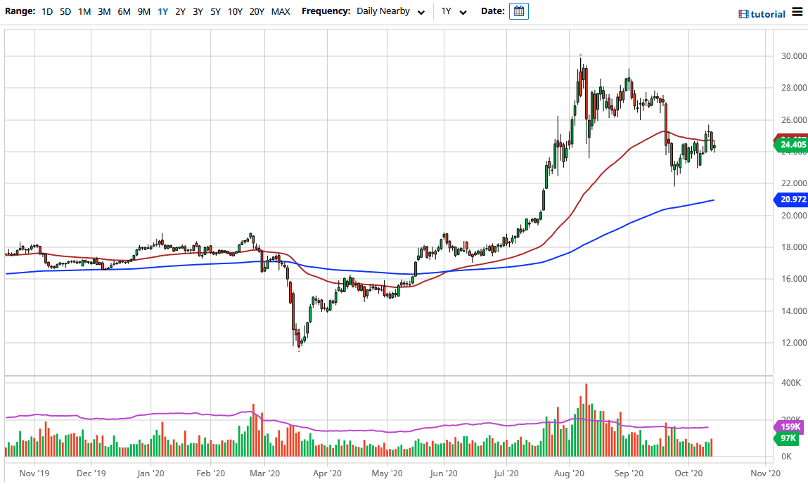 Silver markets have gone back and forth during the trading session on Wednesday, as we continue to dance around the $24 level underneath, and the $50 level above. In fact, that was the range that the market had spent most of the day and during the day on Wednesday, so it looks as if we are continuing to see a lot of confusion.
