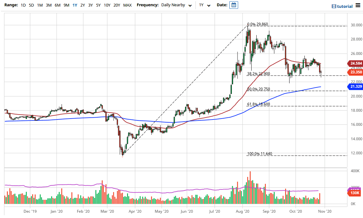 To the downside, I see the 200 day EMA offering plenty of support and of course the $20 level. I think there are plenty of supportive areas between here and there though, so I think we are waiting for some type of supportive candlestick to start buying. The Thursday candlestick may just be that one, but I also recognize that there are probably multiple attempts to form a bit of a base here. We are in the longer-term uptrend and I do not see that changing anytime soon, so obviously I have no interest in shorting this market. I expect to see a lot of choppy behavior, but unless the US dollar takes off, I think silver will probably continue to be very stagnant in the short term.