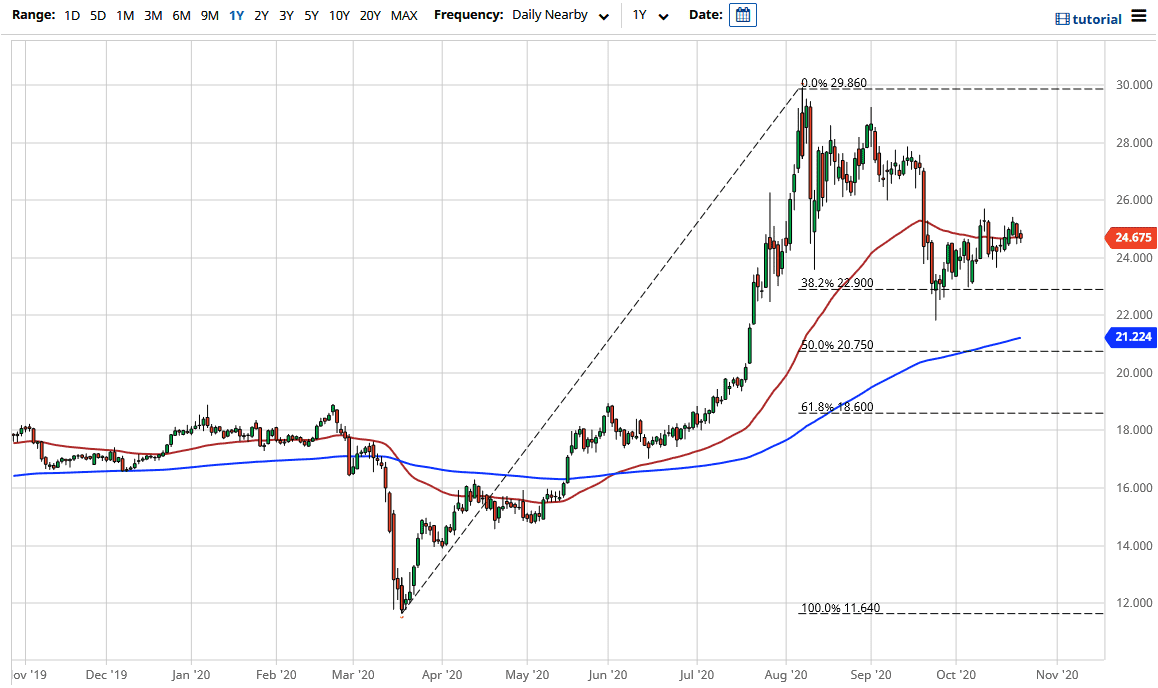 Silver markets have gone back and forth during the trading session on Friday, as we initially tried to rally but gave back the gains early. Later in the day, we have started to recover some of the losses but the most important thing to pay attention to is the fact that we are hanging around the 50 day EMA and simply do not look like we can go anywhere. Looking at the EMA, it is also sideways, so it suggests that we have nowhere to be.