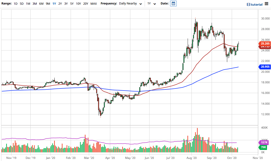 Looking at this chart, we have been in an uptrend for some time, but it is going to continue to move back and forth based upon the US Dollar Index. Ultimately, the US Dollar Index tends to move in the opposite direction of the silver markets, as silver of course is priced in that currency. If the US Dollar Index falls, it is likely that the silver market will rally due to that. This is a market that I think will continue to see that correlation play out, and as the thoughts of stimulus continue to be the most important thing out there as far as traders are concerned, it is likely that the silver markets will be moving back and forth due to that. If we were to break down below the $23 level, it is likely that we could go down to the $22 level, possibly even the 200 day EMA. This would obviously be in reaction to the US dollar strengthening. Looking at this chart, I think that we have a lot of noise ahead of us, so short-term back-and-forth trading is probably the best way forward given the fact that the markets have been so noisy.