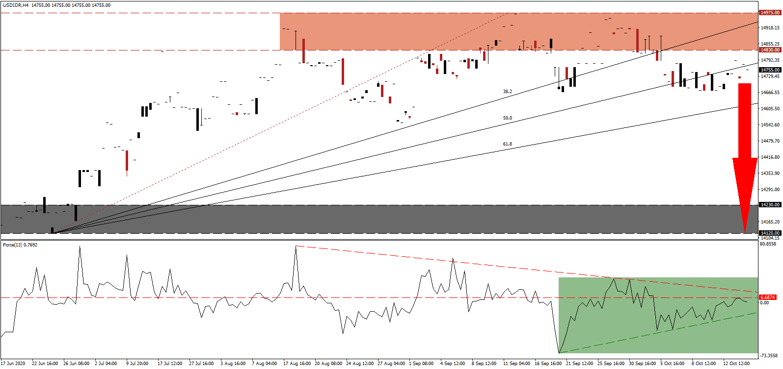 Indonesia became the new Covid-19 hotspot in Southeast Asia, surpassing the Philippines. It is now the eighteenth most-infected country globally and has the seventeenth highest death toll. The world’s fourth-most populous country outlined a plan to distribute an unspecified Covid-19 vaccine from 2021, but many Indonesians may not get access to it. Presently, there is no vaccine available, several tests halted, and developed countries pre-purchased over 50% of supply from leading candidates. The USD/IDR completed a breakdown below its resistance zone, from where a more massive sell-off appears probable.