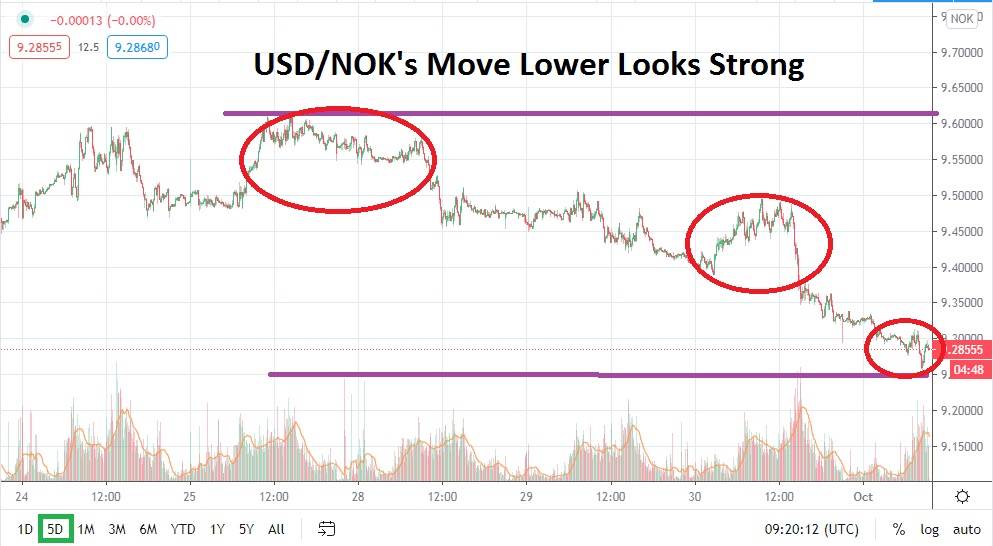 The USD/NOK is trading near the 9.27800 vicinity and this is a remarkably interesting support level. If support can be broken lower the USD/NOK would suddenly be engaged within a trading range it has not traversed since the 21st of September, which is the day the forex pair experienced a spike higher and broke through resistance.