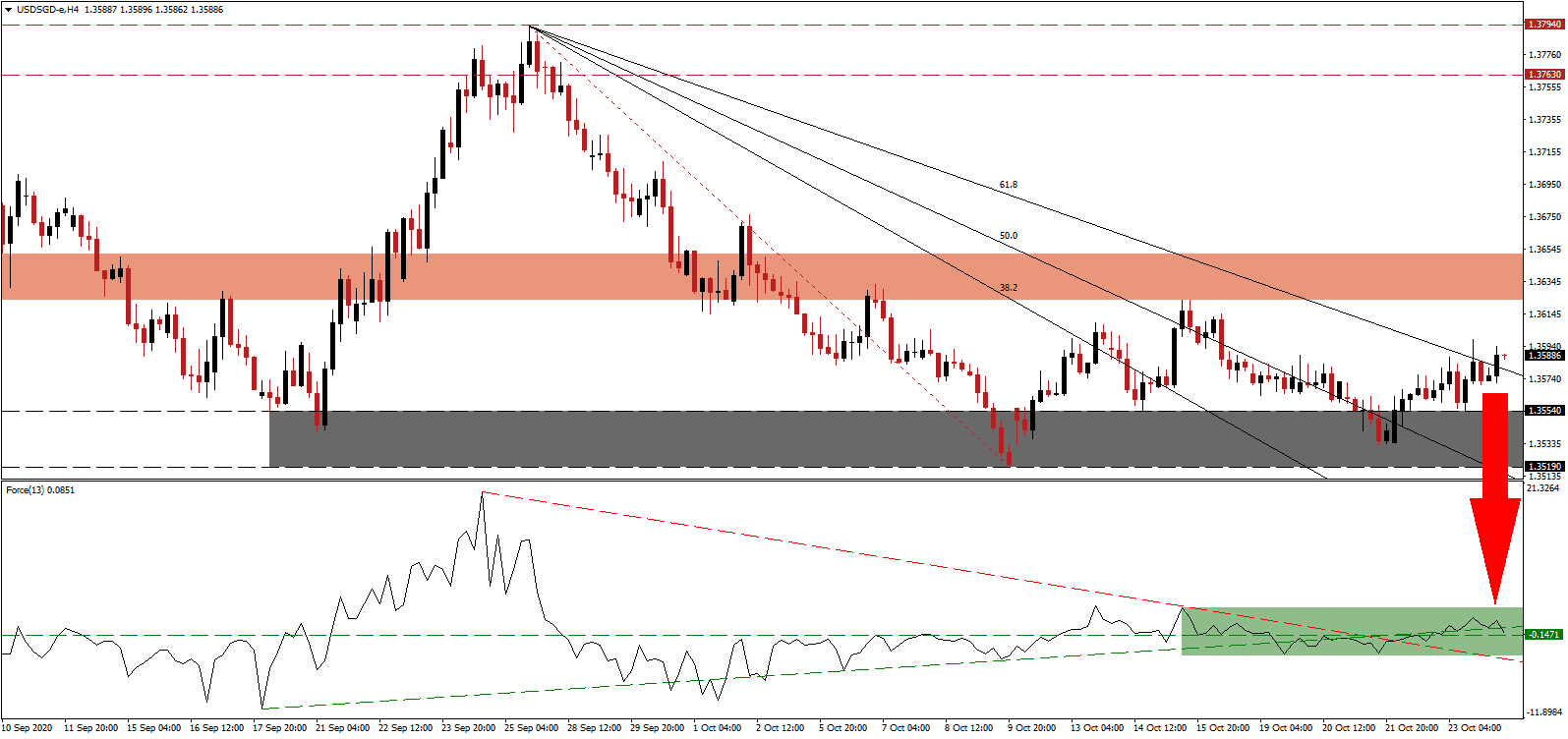 Gan Kim Yong, the Minister for Health of Singapore, announced a pilot project for pre-event Covid-19 testing using Antigen Rapid Tests (ART) on October 20th, 2020. Earlier this morning, it was carried out during the opening of Singapore International Energy Week (SIEW) 2020 and labeled a success. It is part of efforts by the government to ease restrictions on group sizes for events, as the export-oriented Southeast Asian financial center adjusts to a new normal. While the USD/SGD may attempt to spike into its short-term resistance zone located between 1.3623 and 1.3652, as identified by the red rectangle, the long-term bearish trend remains intact, favoring a new breakdown sequence.