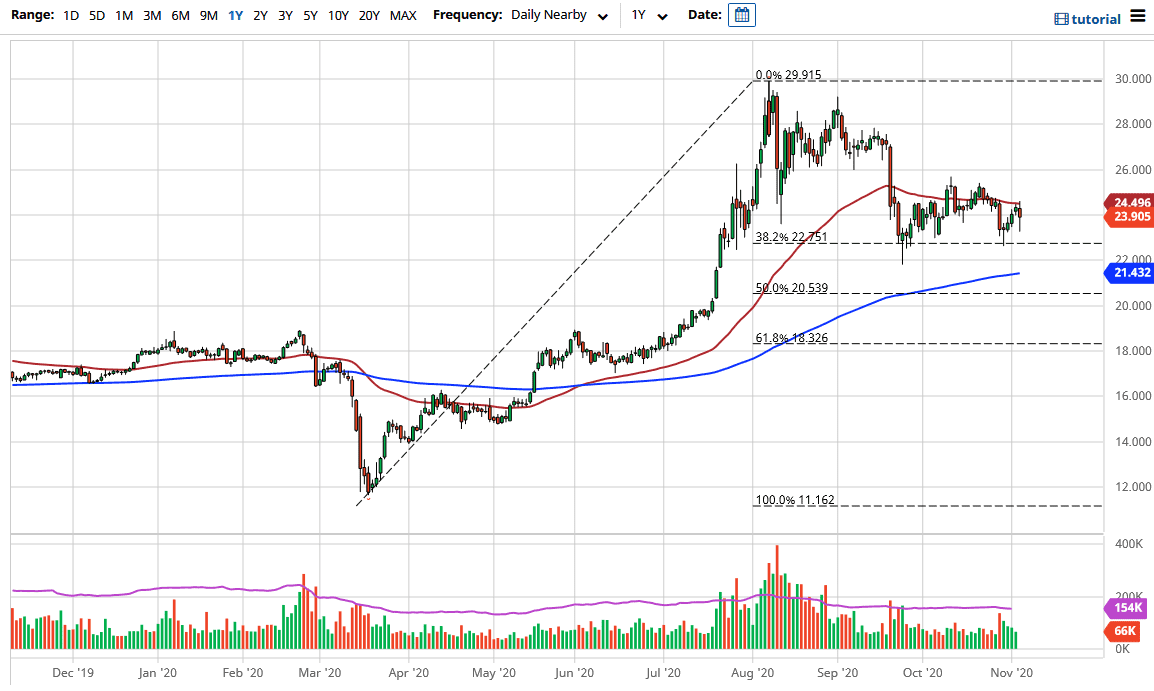 The 50-day EMA above offers resistance, extending all the way to the $26 level. The market simply goes back and forth until we figure out what is happening next, so we are simply waiting to find a little bit of clarity. This will move back and forth with the US dollar, as there is a negative correlation to the silver market as well as the gold market. That is the only thing that people are paying attention to: whether or not we get enough stimulus to crush the US dollar. We probably will get something, but in the meantime, I would anticipate a lot of back and forth between the $25 region and the $22 region underneath.