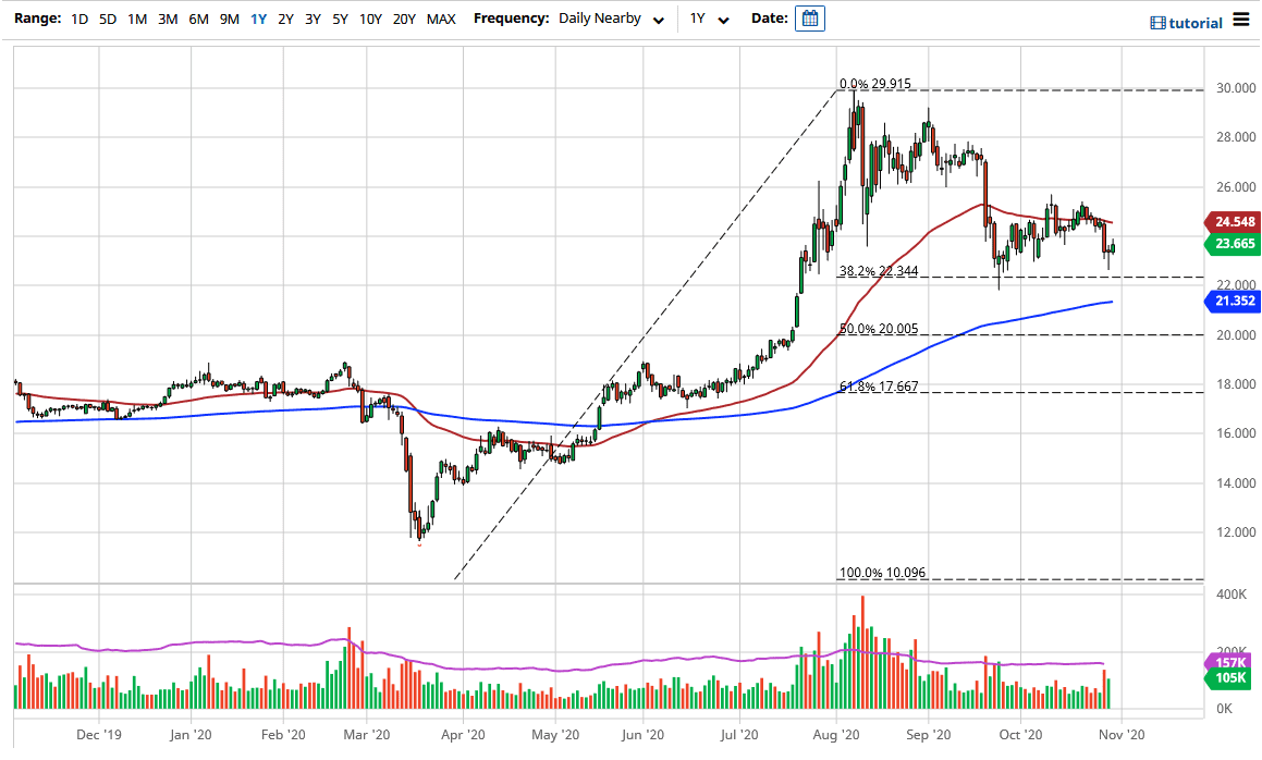 However, the silver market is a bit different due to the fact that it is probably going to be driven by a lack of industrial demand as well, although people believe that stimulus will increase it. I doubt that is the case, and I think everybody is going to be trading on the idea of stimulus more than anything else. Gold will outperform silver in that scenario, but silver will still reach in the same direction. I like the idea of buying dips because of this, because there so much in the way of negativity out there.