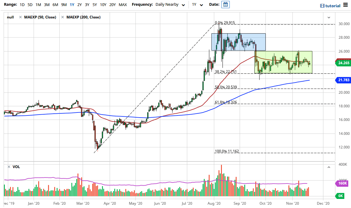 However, I do like silver over the longer term, as central banks around the world continue to flood markets with liquidity and people will be looking for a way to protect wealth. Beyond that, we had a massive rally previously and we need to grind sideways in order to digest gains. That is a lot of what is going on right now, as the 50-day EMA is basically flat. The 200-day EMA sits underneath and is sloping higher; it looks likely that we will see it reach towards the bottom of the green box I have drawn on the chart, so we should see support again. The $22.75 level is where I have the place, and it also coincides quite nicely with the 38.2% Fibonacci retracement level. There are a few reasons to think that the area should hold, so it will be interesting to the buyers out there.