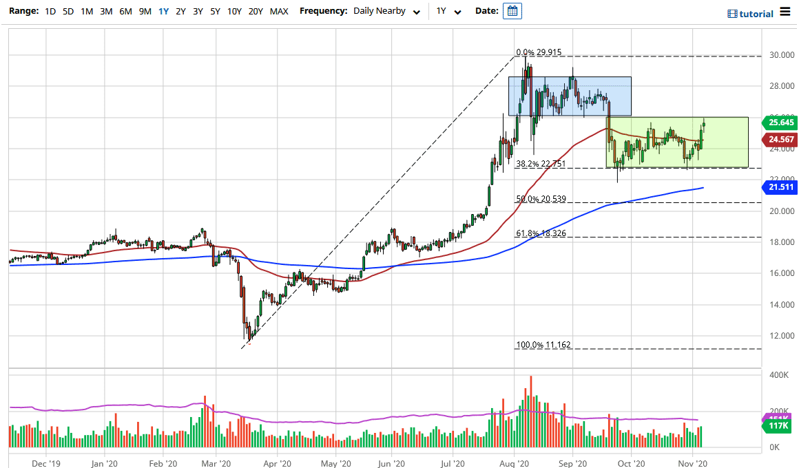 The $23 level underneath is massive support, as it is not only where we have seen the buyers jump back into the market, but we have also seen the 38.2% Fibonacci retracement level show up there. I do not have any interest in shorting silver. Longer term, this market goes to extraordinarily high levels. It is not only the Federal Reserve, but it also is the Reserve Bank of Australia, European Central Bank, and the Bank of England that are all going to be flooding the markets with liquidity, thereby driving up the demand for hard assets such as silver. Under no circumstances will I be selling silver, because even if we do see the US dollar strengthening, both can go in the same direction eventually, but the short term directionality is of course very negatively correlated.