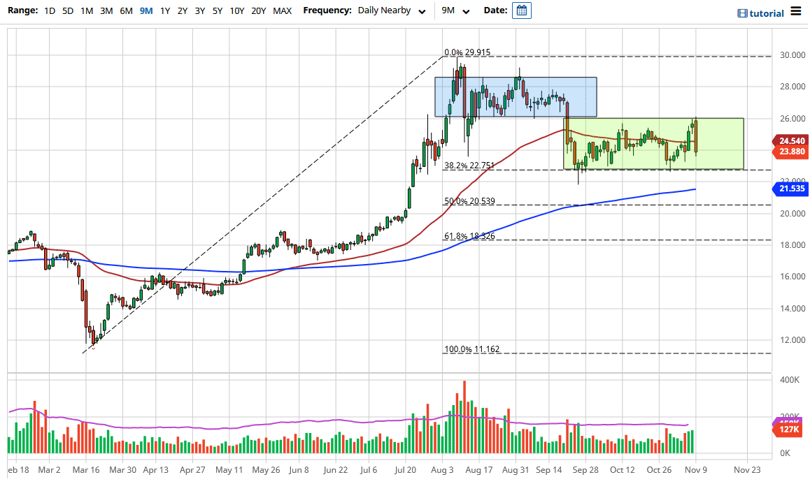 The silver market formed a large candlestick, reaching down below the $24 level. However, we are starting to find some support, so we will turn things back around. Looking at this chart, it is only a matter of time before the buyers return, even if we drop down below the $22.75 level which has been massive support. The 200-day EMA underneath could offer support near the $21.50 level, but even below there we would see a lot of support at the $20 level.