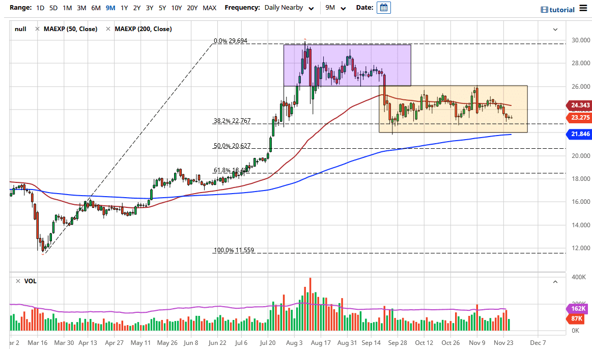 The 200 day EMA sits just below at the $21.84 level, so there is more or less going to be a “zone of support” underneath that should continue to keep this market somewhat elevated. This is a market that I think it does go higher over the longer term, due to the fact that central banks around the world continue to flood the world with liquidity and of course people will look towards “hard assets” such as gold and silver in order to preserve wealth. The 50 day EMA above is showing signs of resistance, and it is likely that the market is probably going to go back and forth in this general vicinity, perhaps trying to build up a bit of a base before we can continue the longer-term uptrend.