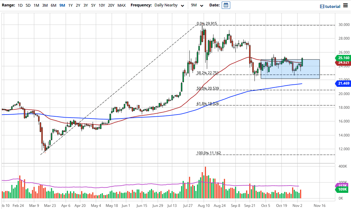 Now that silver has broken above the $25 level, it is going to find a lot of resistance just above. While I do not necessarily think that we break out, it is clear that we should not be selling silver either. After all, there has been a significant amount of support leading to this area, so I think it is only a matter of time before the buyers will try to push higher. I like the idea of buying pullbacks though because we have expended so much energy to get here.