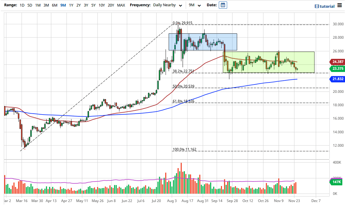 The $22.75 level is an area that has been supportive several times, so it is not a huge surprise to see that we have stabilized there. It is the scene of the 38.2% Fibonacci retracement level and has the 200-day EMA rapidly approaching it. These are all reasons to think that perhaps there should be buyers sooner rather than later, but we need to pay attention to the US Dollar Index. The negative correlation between the two markets has been relatively high as of late and, depending on your timeframe, has been as high as -0.9 which is a pretty strong reading.